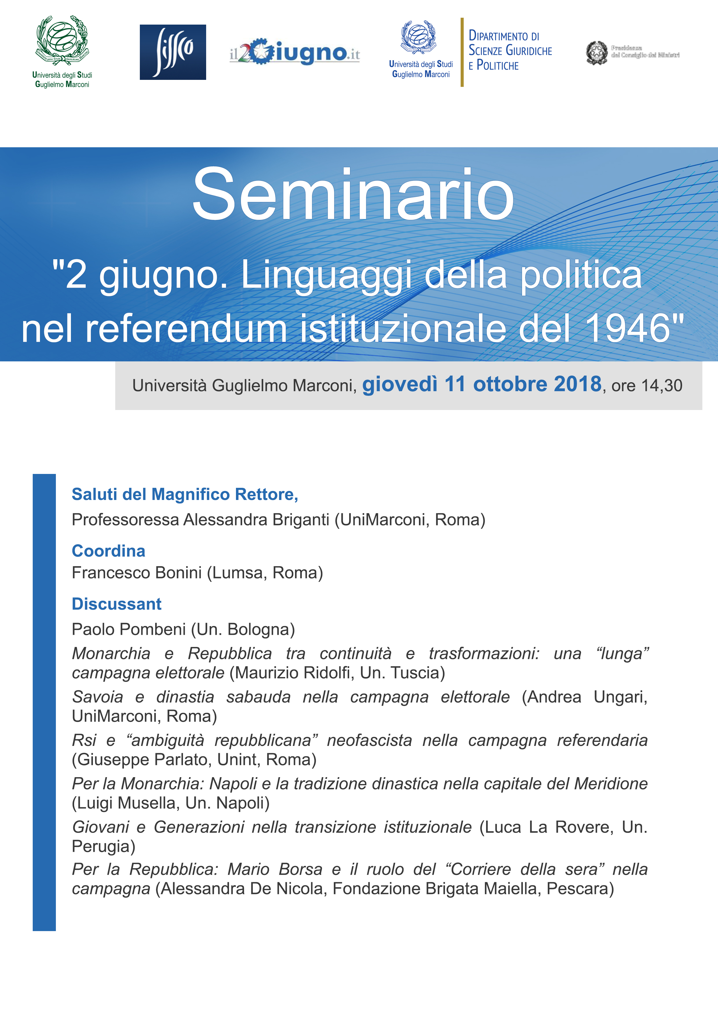 Seminario nell’ambito del progetto 2 Giugno. Linguaggi della politica nel referendum istituzionale del 1946 , promosso dalla Società Italiana per lo studio della Storia Contemporanea (SISSCO), patrocinato dal Comitato Storico-Scientifico per gli Anniversari di Interesse Nazionale della Presidenza del Consiglio dei Ministri .