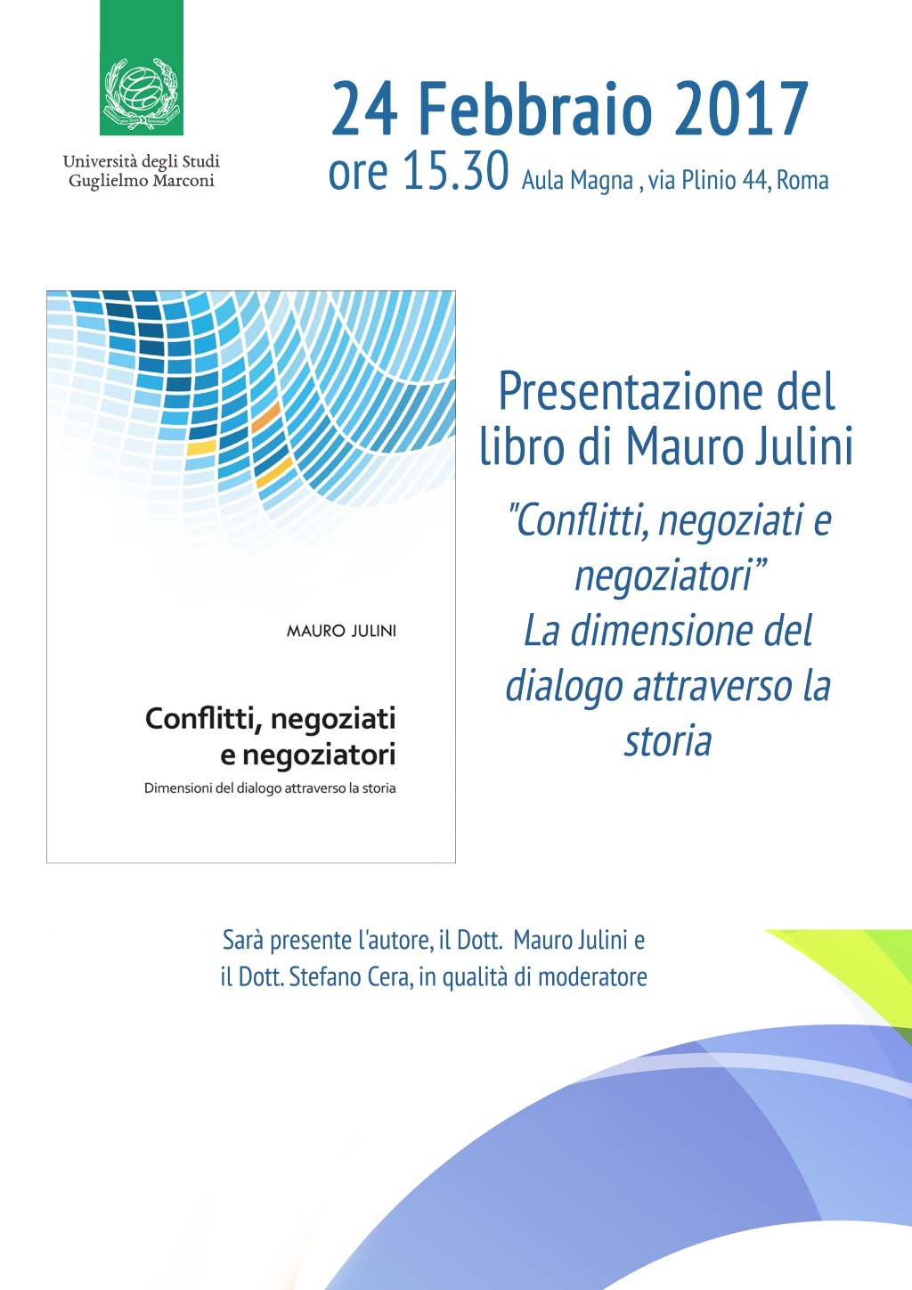 24 Febbraio 2017 dalle 15:30 fino alle 18:00 Presentazione del libro: “Conflitti, negoziati e negoziatori“ La dimensione del dialogo attraverso la storia Pressp Aula Magna , Via Plinio 44 Il testo ricerca ed analizza attività strutturate ed articolate di facilitazione del dialogo e di decisioni comuni prodotte da attività negoziali, facilitative e mediative, come strumenti e, al tempo stesso, come punti d’osservazione di accadimenti ed avvenimenti registrati dalle pagine della storia. Scarica la locandina Sarà possibile seguire la diretta streaming dell’evento cliccando sul link: https://www.unimarconi.it/it/marconi-channel