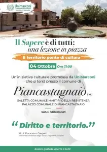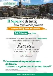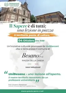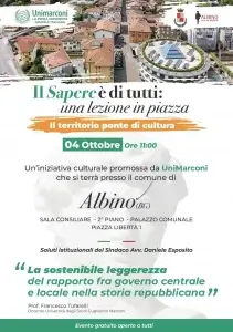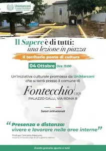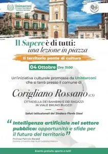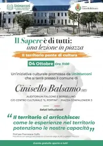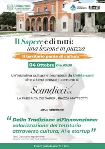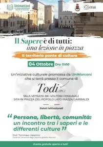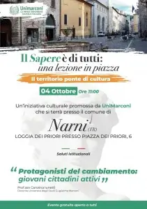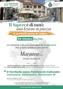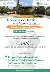 L’Università degli Studi Guglielmo Marconi promuove “Il sapere è di tutti – Una lezione in piazza”, un’iniziativa culturale di respiro nazionale che, il 4 ottobre 2025, vedrà svolgersi in contemporanea lezioni pubbliche e gratuite in 20 Comuni italiani.