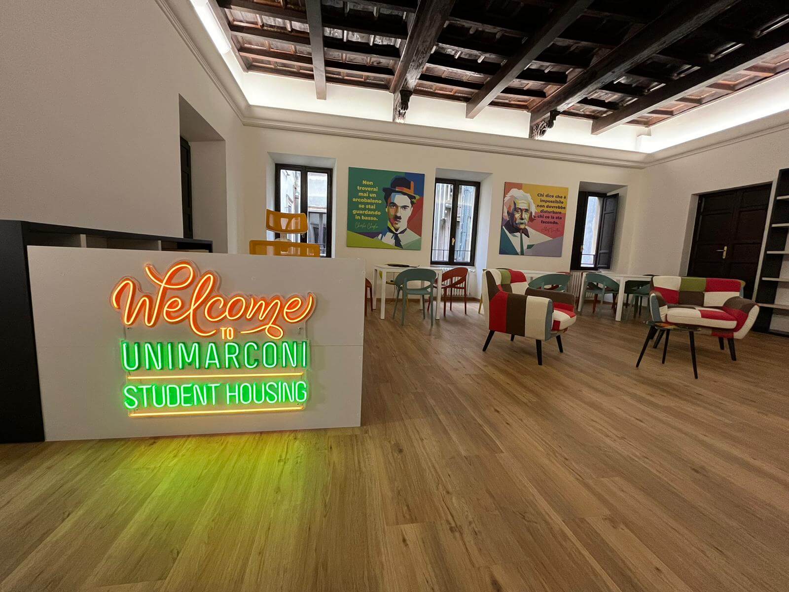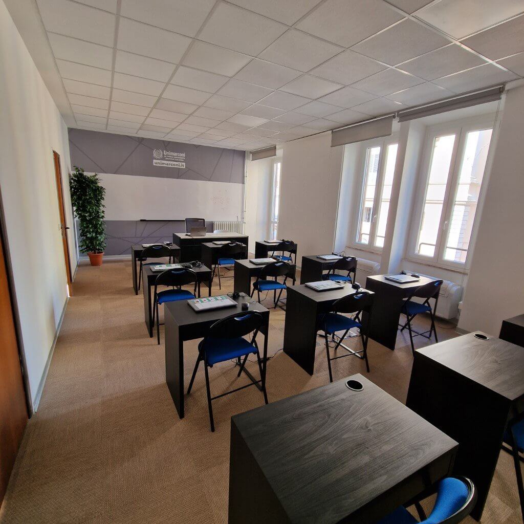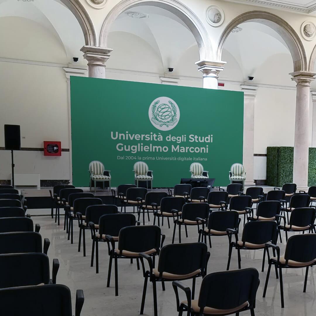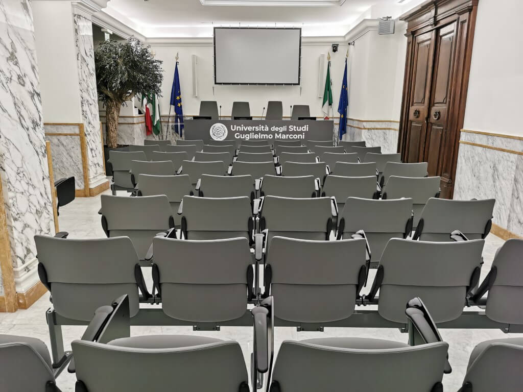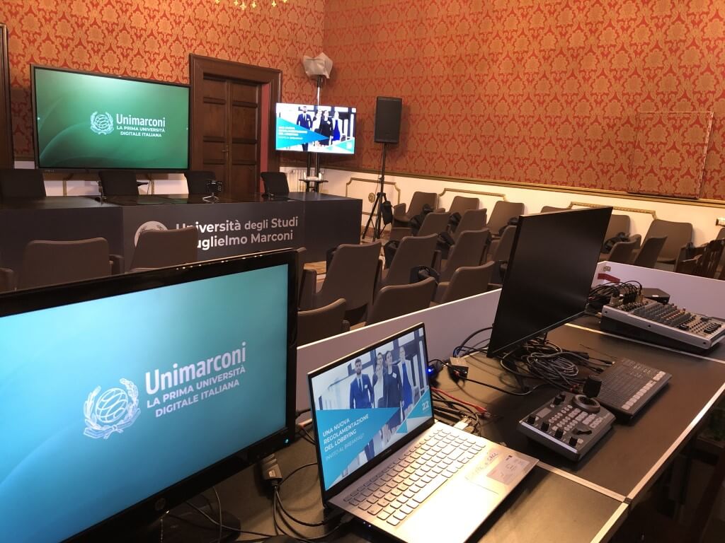 Spazi di Ateneo Unimarconi ha recentemente completato un significativo processo di ammodernamento e riqualificazione delle sue sedi e aule, offrendo agli studenti un ambiente accogliente e all’avanguardia. Le aule sono state progettate tenendo conto dell’efficienza e della funzionalità, garantendo un ambiente ideale per lo studio e sono state dotate di attrezzature tecnologicamente avanzate. È stato realizzato: Nuovo centro di produzione multimediale con utilizzo di tecnologia 4K, lavagne elettroniche sperimentali e ledwall di ultima generazione. Nuovo Studentato ispirato ai modelli di eccellenza internazionale per l’erogazione di un’offerta formativa in modalità ibrida. Nuove Aule ibride per le lezioni in presenza e aree studio attrezzate per lo studio interattivo. Student-hub come nuovo spazio di condivisione per studenti e docenti. Intervento di restyling dell’Aula Plinio, Aula Magna e Aula Balli, rivisitate non solo nel design ma anche dotate di una sofisticata tecnologia. Uno spazio didattico unico nel suo genere, che combina le funzionalità di un’aula moderna, presenziale e multimediale con la bellezza e l’unicità di una delle terrazze più suggestive di Roma. Scarica la brochure Aula Plinio L’Aula Plinio, dotata di tecnologie di ultima generazione, offre uno spazio versatile e polivalente adatto a qualsiasi tipo di evento. Capienza: 75 posti a sedere più 4 relatori in presenza. Dotazione tecnica3 Telecamere PTZ, mixer video ATEM Television Studio, microfono gelato, stazione microfonica Tiden con microfoni da tavolo, audio mixer Shure, Proiettore Epson.Possibilità di avere diversi tipi di piattaforme in diretta streaming (Zoom, Meet ecc. ecc.) Terrazza Prati Una location esclusiva, con annessa terrazza che offre una magnifica vista sulla Cupola di San Pietro, è il luogo perfetto per incontri istituzionali e di grande pregio. Capienza: 35 posti Dotazione tecnicaTricaster Mini 4k3 telecamare Canon PTZ con tecnologia NDI,control surface per remoto camere, 4 microfoni sennheiser configurabili (gelato o lavalier)Monitor Samsung 85” per proiezioneMixer audio, possibilità di avere musica in sottofondo sia all’esterno che all’interno della sala. Aule Paolo Emilio Numerose aule di varie capienze, pensate per soddisfare ogni esigenza didattica. Le aule sono dotate di attrezzature all’avanguardia e connessione internet ad alta velocità. Aula 6Capienza: 50 posti Aula 10Capienza: 15 posti Aula 21Capienza: 40 posti Aula 22Capienza: 15 posti Aula 31Capienza: 33 posti Aula 40Capienza: 20 posti Sala studio La sala studio è un ambiente accogliente e funzionale, con spaziose scrivanie e rete wifi, pensato per lo studio degli studenti. Capienza: 24 posti Prenota il tuo posto Aula Balli L’Aula Raffaele Balli è uno spazio dedicato alla presentazione delle tesi di laurea o di dottorato. Capienza: 30 posti a sedere Dotazione tecnicaSmartboard 85” LIMMonitor dirette StreamingMonitor di Ritorno Sorgenti VideoRegia BlackMagic ATEM con cam PTZ NDI Terrazza Paolo Emilio La Terrazza Paolo Emilio è uno spazio dedicato agli studenti, un luogo ideale per lo studio, l’incontro ed il relax. Aula Magna La prestigiosa Aula Magna è ubicata all’interno dell’elegante Palazzo d’epoca Simonetti-Odescalchi e si presenta come un unico grande spazio limitato tutto intorno da una sequenza di maestose colonne. Grazie alle più avanzate tecnologie, l’Aula Magna è idonea per ospitare eventi istituzionali. Capienza: 200 posti Dotazione tecnicaComposta da mixer audio digitale Beringher MX32, microfoni Sennheiser con amplificatori d’antenna per estendere il segnale a diversi metri, mixer video ATEM Television Studio HD, camere Blackmagic Studio camera 6K Pro Sala Giulio Cesare La Sala Giulio Cesare si trova nel prestigioso Palazzo Simonetti-Odescalchi e dispone di tutte le attrezzature necessarie per ospitare eventi culturali e accademici. Capienza: 35 posti a sedere Dotazione tecnicaMixer Atem Extreme Pro ISO, pc supporto relatore (ppt, pdf e video).Lavagna LIM 85”, monitor per collegamenti esterni,3 microfoni da banco, mixer audio,2 microfoni gelato3 Telecamere PTZ Marshall NDI con remote control, pc per conferenze ZOOM, Meet, Skype ecc.Possibilità di diretta streaming Studentato Internazionale Nel 2023, l’Università degli Studi Guglielmo Marconi ha inaugurato un moderno studentato nel cuore di Roma, pensato per offrire un’esperienza di vita confortevole e stimolante ai suoi studenti internazionali. Situato vicino alla Città del Vaticano, l’alloggio combina la praticità con un ambiente accogliente e culturalmente ricco. Scarica la brochure Caratteristiche principaliPosizione centrale: lo studentato è situato nel centro di Roma, permettendo agli studenti di immergersi nella dinamica atmosfera della città e di accedere facilmente ai suoi luoghi iconici.Spazi abitativi confortevoli: ogni camera è arredata con letti comodi e scrivanie ergonomiche, creando un ambiente ideale per lo studio e il riposo.Aree Comuni Moderne e funzionali: cucine attrezzate e spazi comuni accoglienti promuovono la socializzazione e l’interazione tra gli studenti.Ambiente di Supporto: lo studentato offre una comunità di supporto pensata per favorire sia il successo accademico che la crescita personale degli studenti. Dettagli dell’alloggio– 12 camere con 28 posti letto singoli e un letto matrimoniale– 2 bagni con docce specifici per genere (totale di 8 docce); 9 bagni (4 comuni)– 1 bagno privato per disabili; 1 bagno comune per disabili– 1 lavanderia; 1 cucina; 5 locali tecnici; 4 aree comuni (svago, mensa, studio, ecc.)Il design delle strutture è stato curato per garantire un’atmosfera propizia alla collaborazione e alla condivisione delle conoscenze tra gli studenti, rendendo il soggiorno a Roma un’esperienza indimenticabile.