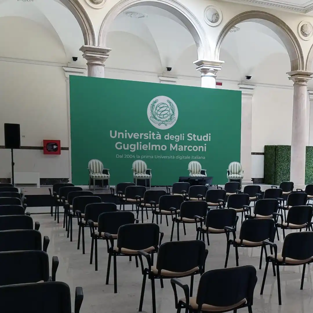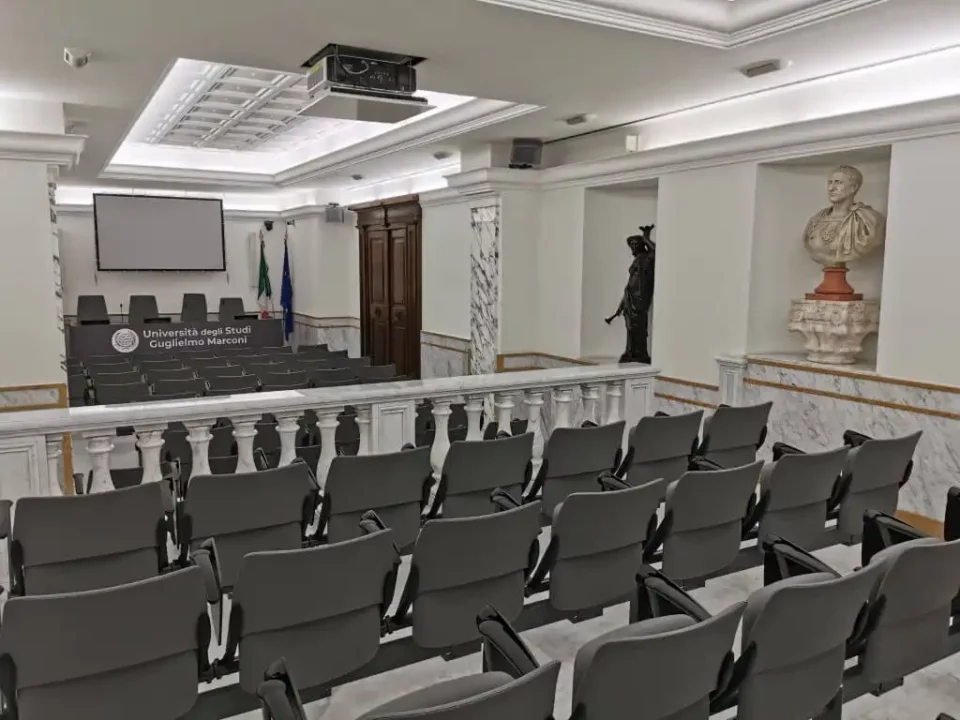 La prestigiosa Aula Magna è ubicata all’interno dell’elegante Palazzo d’epoca Simonetti-Odescalchi e si presenta come un unico grande spazio limitato tutto intorno da una sequenza di maestose colonne. Grazie alle più avanzate tecnologie, l’Aula Magna è idonea per ospitare eventi istituzionali.